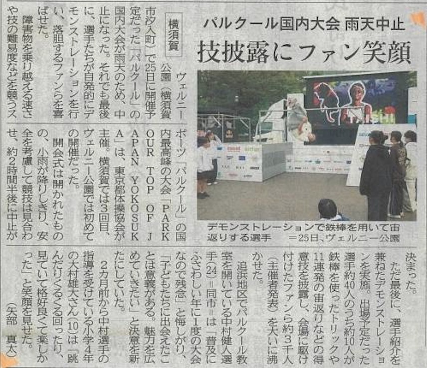 『PARKOUR TOP OF JAPAN YOKOSUKA 2025』 神奈川新聞掲載 NEWS 東京都体操協会パルクール委員会 2025/10/27 19:34 フォロー パルクール日本一決定戦‼️PARKOUR TOP OF JAPAN YOKOSUKA 20252025年10月25日(土) 横須賀市 #ヴェルニー公園 いこいの広場#神奈川新聞 に掲載されました! URLをコピーする 報告する
